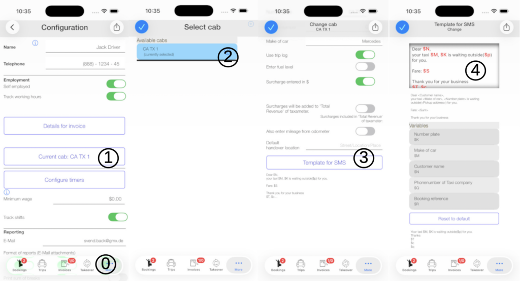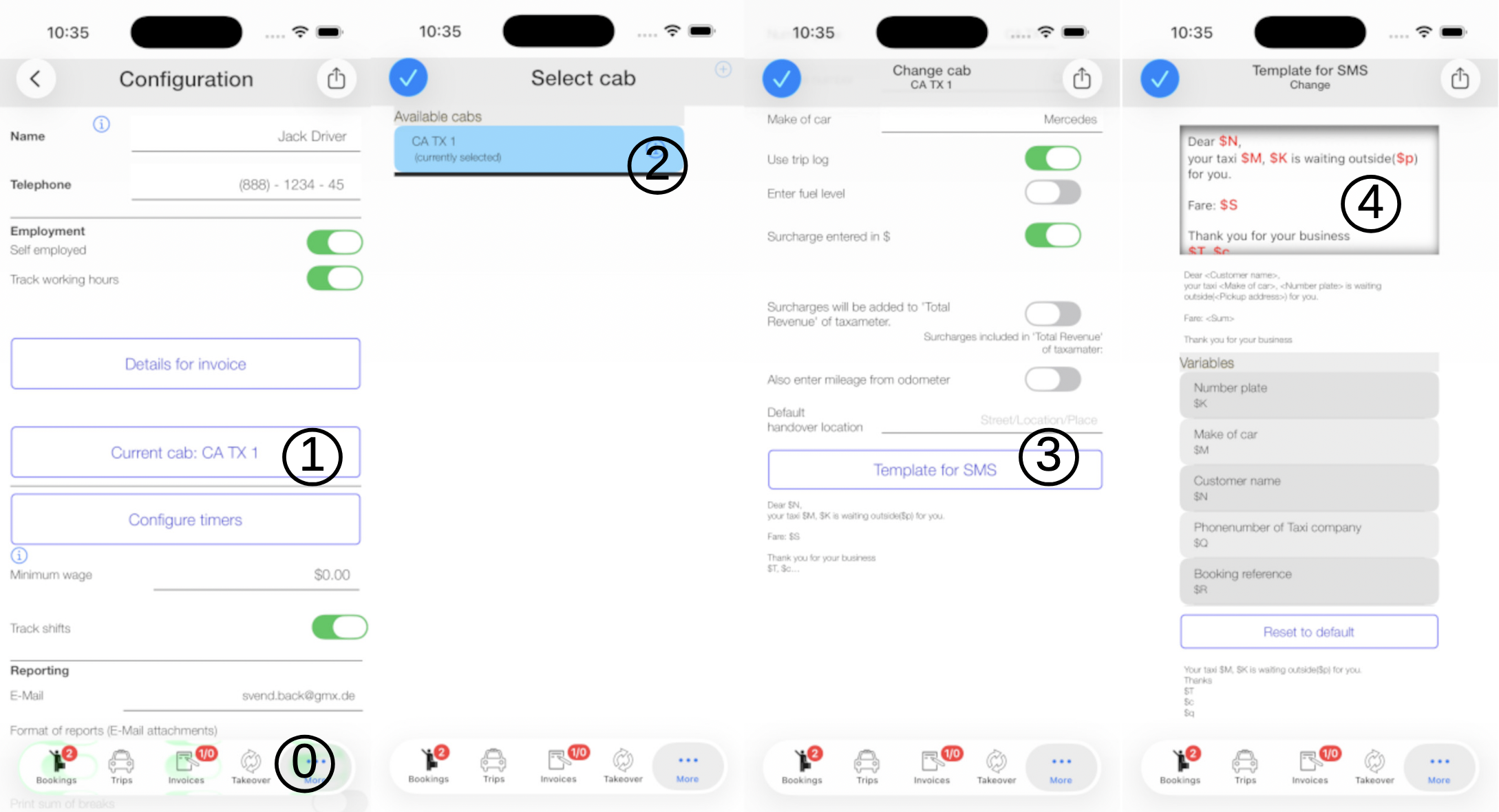 You will find the configuration menu under „Config“ (0) -> „Current cab: ….“ (1) -> (i) right to the current car (2)-> „Template for SMS“ (3). When you enter the text (4) you can enter Variables like $S for the sum of the fares.